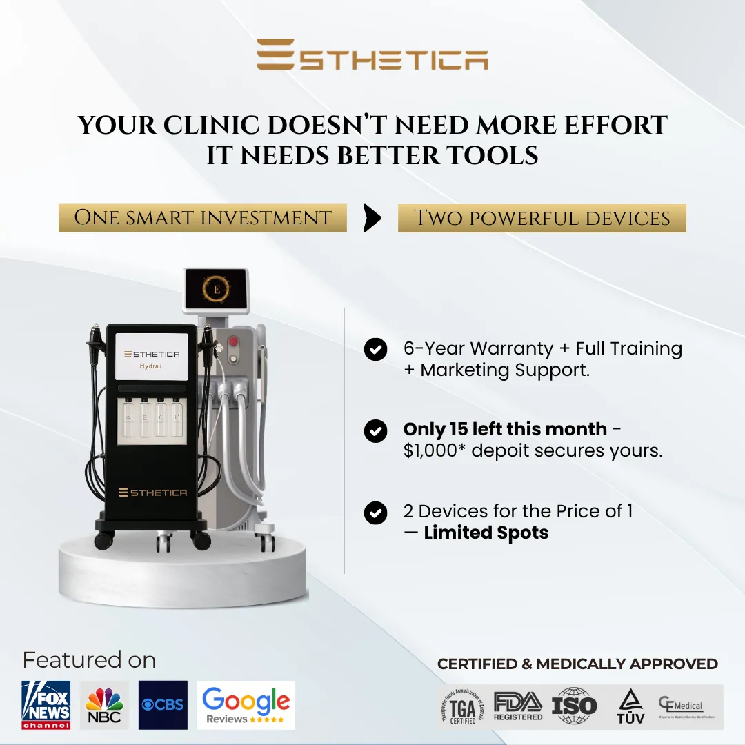 Build a full treatment menu on Day 1 with e-Luxx (Diode, IPL, Nd:YAG, RF) + 1 device FREE: choose Hydra+, Lumina LED, Hi-Rex HIFU, or Antige Frac.